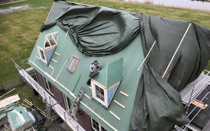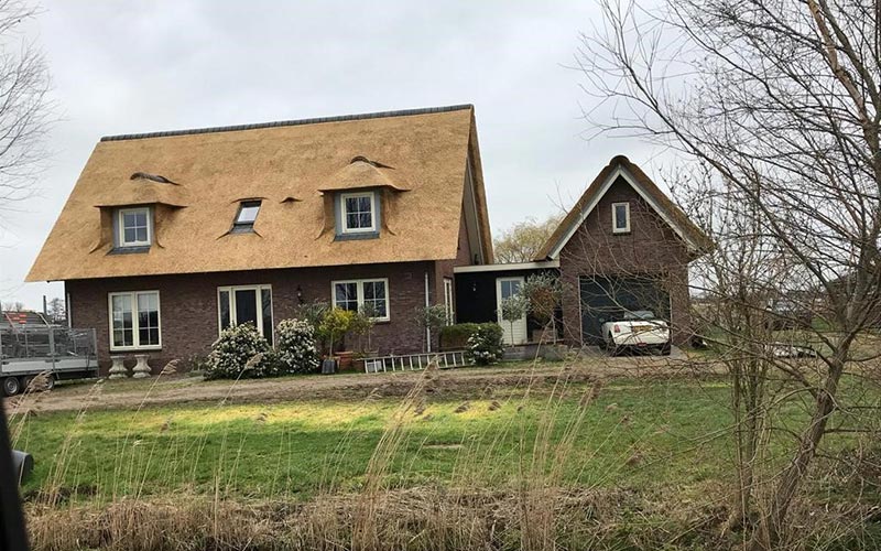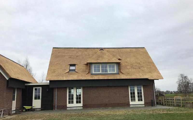 Heel fraai is deze metamorfose een uitdaging van een pannen dak naar een rieten dak. Het dak is gedekt met chinees riet en is afgewerkt met blauwe nokvorsten. Ook geïnteresseerd van pannen naar riet? Vraag naar de mogelijkheden.