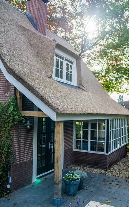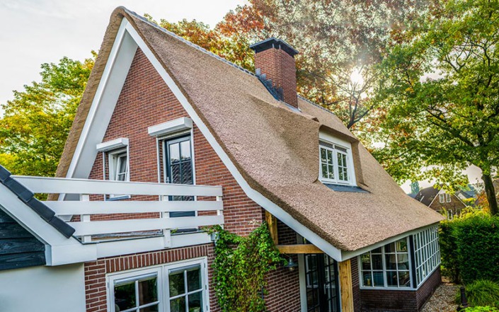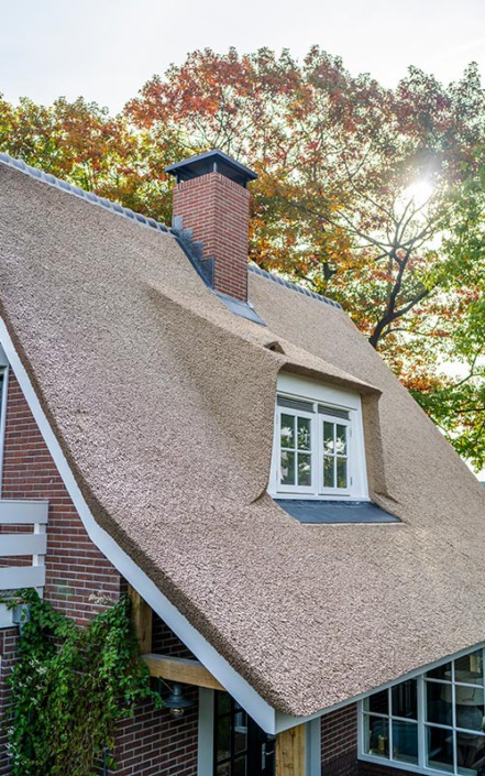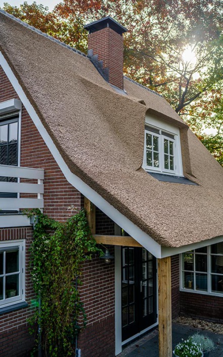 Van pannen naar kunstrieten dak van Techriet ,weer een bijzondere expertise van De Rietdekker. De nok is afgewerkt met donkerblauwe nokvorsten wat het een mooie uitstraling geeft.