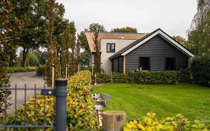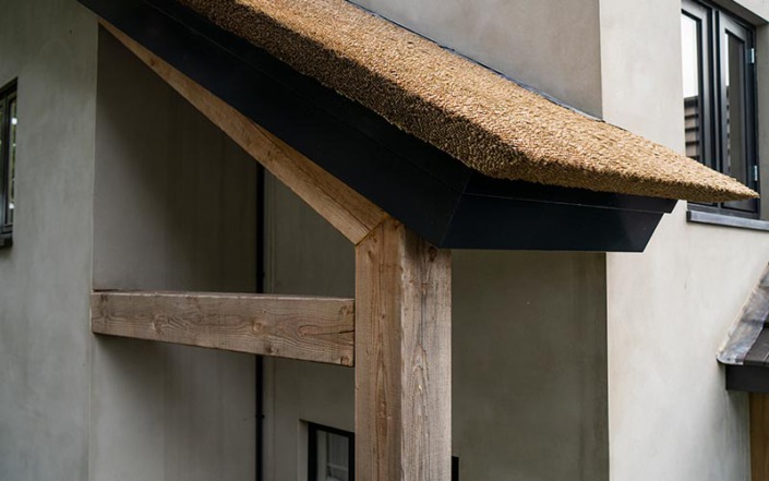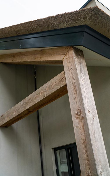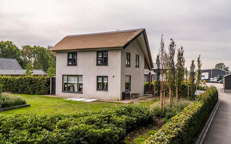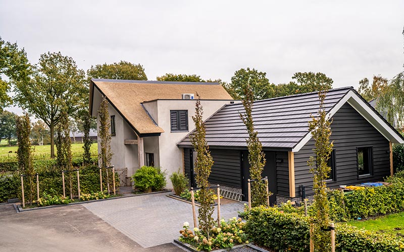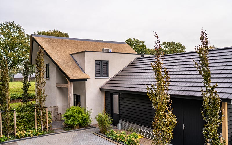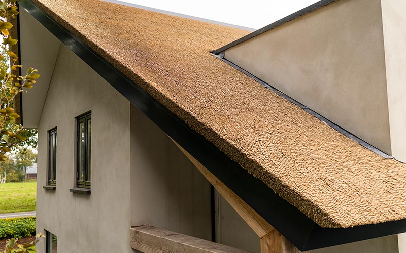 Een prachtig kunstrieten dak gerealiseerd met Techriet , zeer duurzaam en onderhoud arm geeft een ambachtelijke en rijke uitstraling. Niet van echt te onderscheiden.