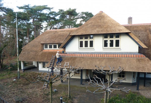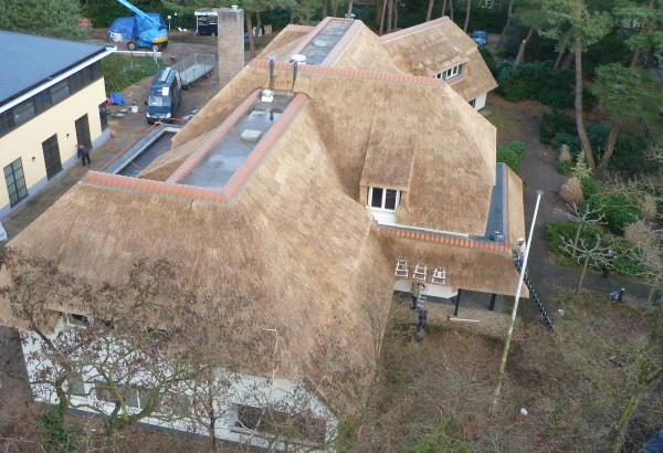Dit kantoorpand in Bilthoven was toe aan een nieuw rieten dak. We hebben extra aandacht gegeven aan de isolatiewaarde van het rieten dak . Met name in een kantoorpand is het van belang dat de energiekosten goed binnen de perken blijven. We hebben de open constructie omgezet naar een gesloten constructie en daarbij bovendien zeer efficiënt en vlot gewerkt. Het aanbrengen van een nieuw rieten dak op een groot kantoorpand is een grote klus, maar dankzij onze ervaring en expertise zijn we daar in de omgeving van Utrecht uitstekend en snel in geslaagd.