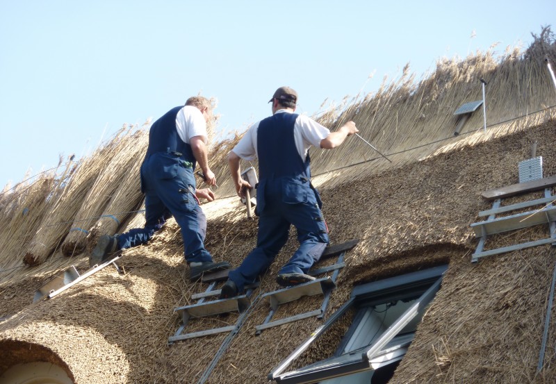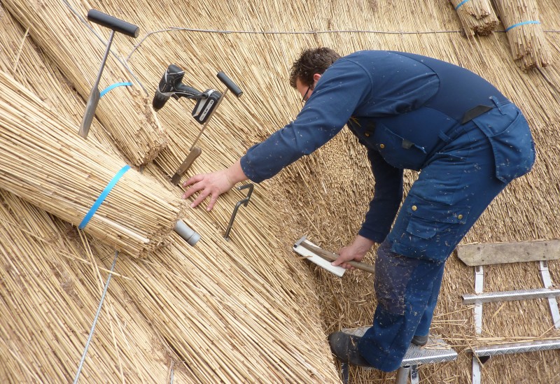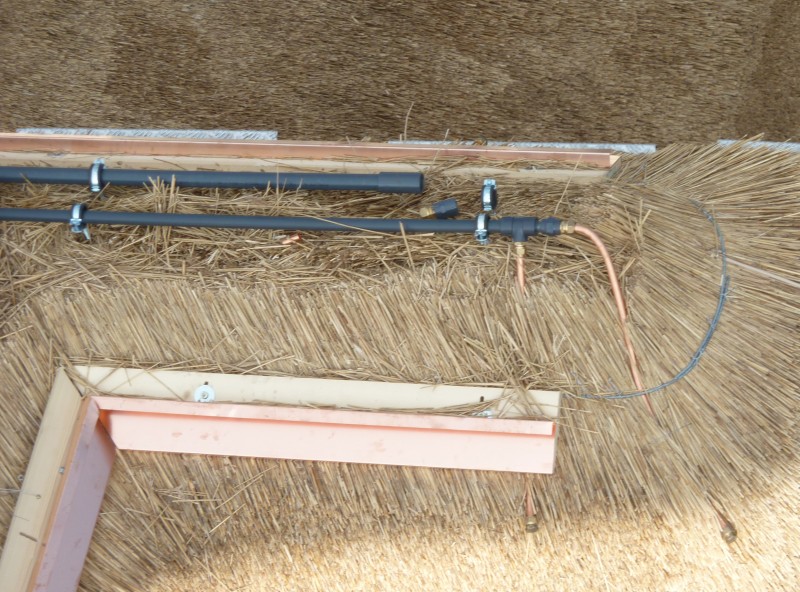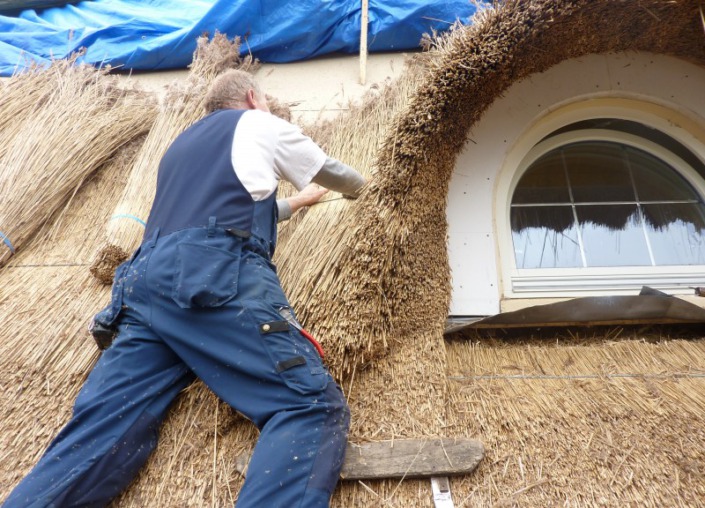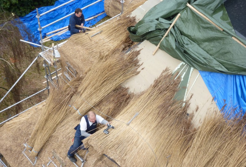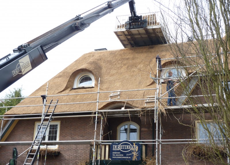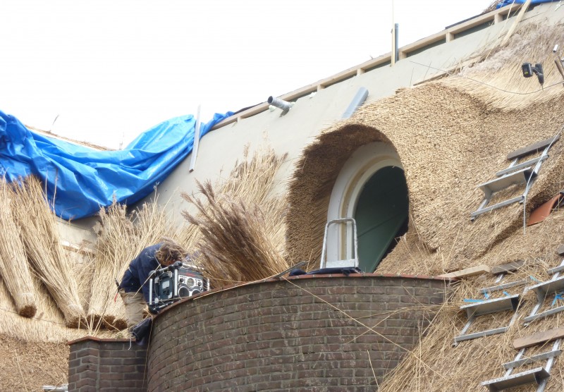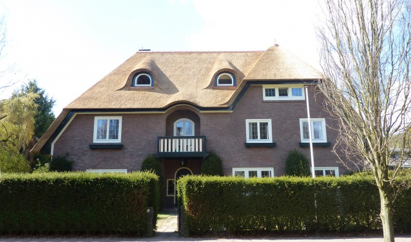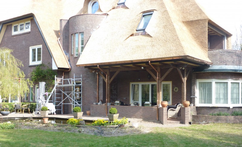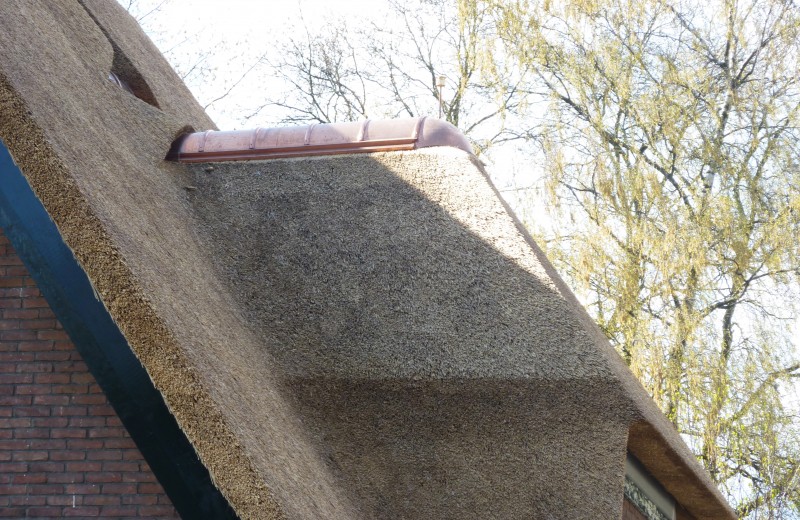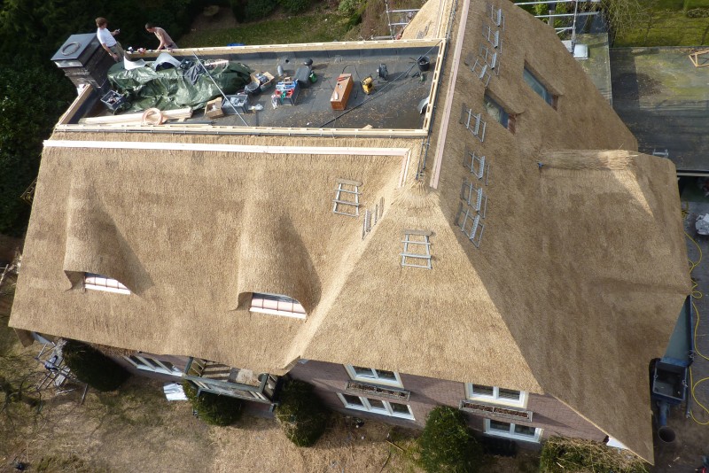 We hebben in deze woning in Velp de uitdaging van 2011 gevonden. Men vroeg ons oorspronkelijk het pannendak door een rieten dak te vervangen. Na onze grondige inspectie hebben we een advies uitgebracht met betrekking tot het complete dak. We hebben ons onder andere gericht op de complete isolatie van het dak, de verfraaiing met behulp van de details, het aanbrengen van koperen vorsten en ook het plaatsen van een vonkenvanger, naast de sprinkler installatie.