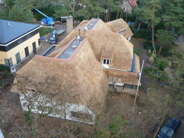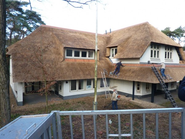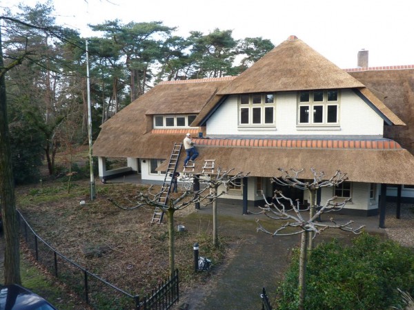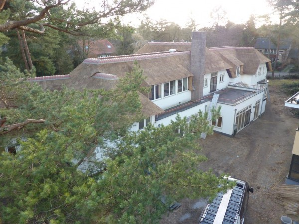 Deze villa in Bilthoven hebben wij voorzien van een rieten kap met gesloten constructie. Hiervoor beschikte de villa over een open constructie, waardoor het riet aan de binnenkant zichtbaar was. Het aanbrengen van deze gesloten constructie heeft ervoor gezorgd, dat de isolatiewaarde van het pand aanzienlijk is verbeterd. Dit hebben wij weten te realiseren door onder andere 835 m2 timmerwerk aan dakplaten en een schroefdak aan te brengen. De villa functioneert op dit moment als kantoorpand en voldoet met deze gesloten constructie aan alle moderne eisen op het gebied van isolatie. Ook in dit project konden onze ervaren rietdekkers hun vakmanschap tot uiting brengen.